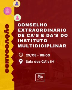 A Coordenação Central do Diretório Central dos Estudantes da UFRRJ (DCE/UFRRJ) anuncia a convocação do Conselho Extraordinário de CA’s (Centros Acadêmicos) e DA’s (Diretórios Acadêmicos) do Instituto Multidisciplinar da Universidade Rural (IM/UFRRJ).