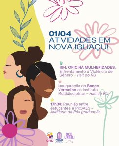 A Oficina Mulheridades: enfrentamento à Violência de Gênero, além da inauguração do Banco Vermelho do IM. Os dois eventos acontecerão no hall do Restaurante Universitário (RU).
